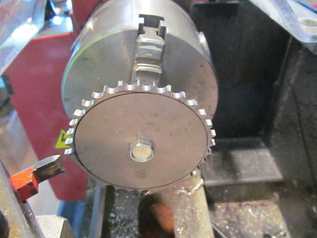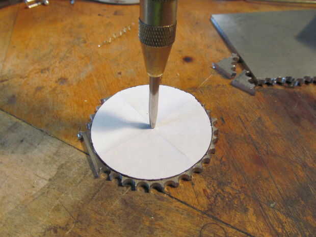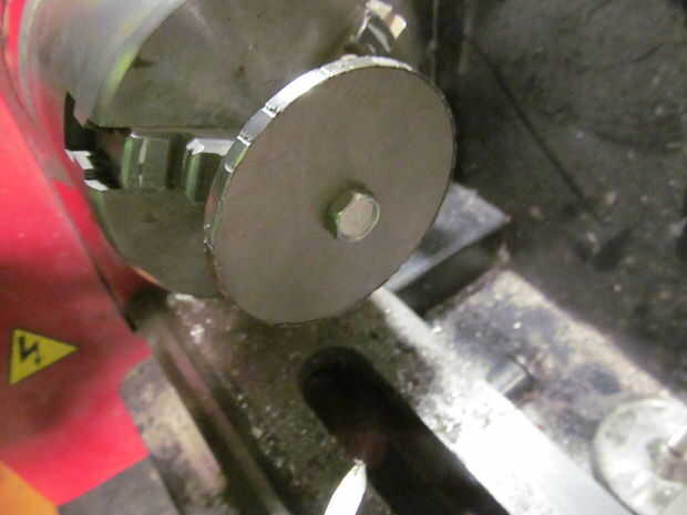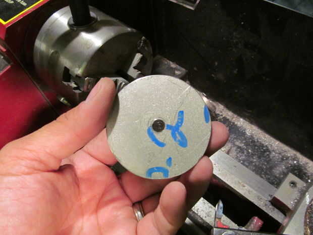 Antes de montar la placa en mi torno del que tenía que encontrar el centro. Para ello cortar un círculo de papel y dobla por la mitad dos veces. Luego usé un punzón para marcar donde se cruzaron los pliegues. He perforado un agujero y había montado en una tuerca y un tornillo. Esto fue por mucho la parte mucho más tiempo. Después del mecanizado de titanio, mecanizado acero sentía como cortar mantequilla.
