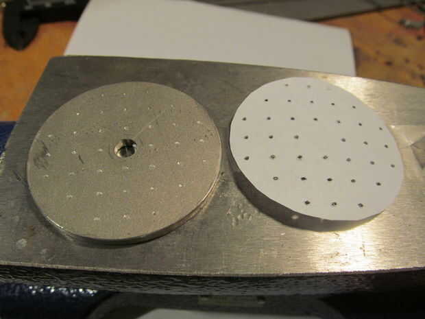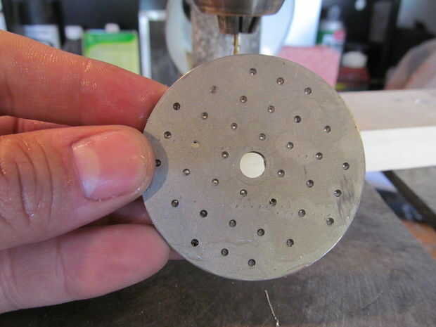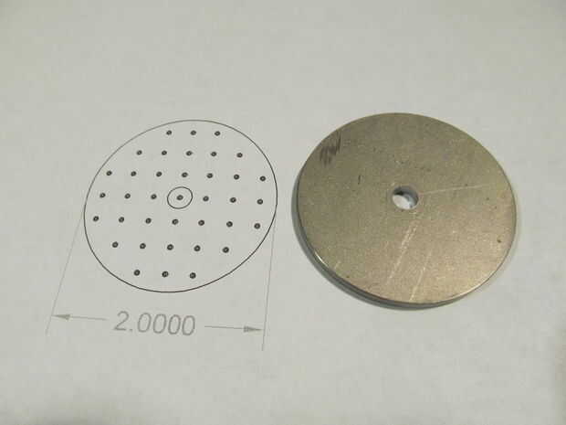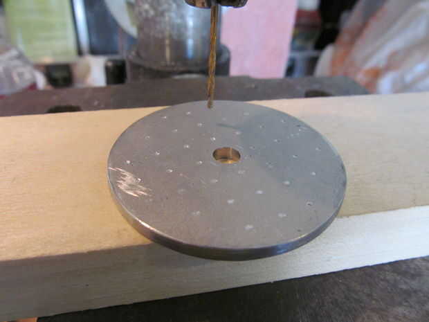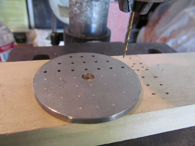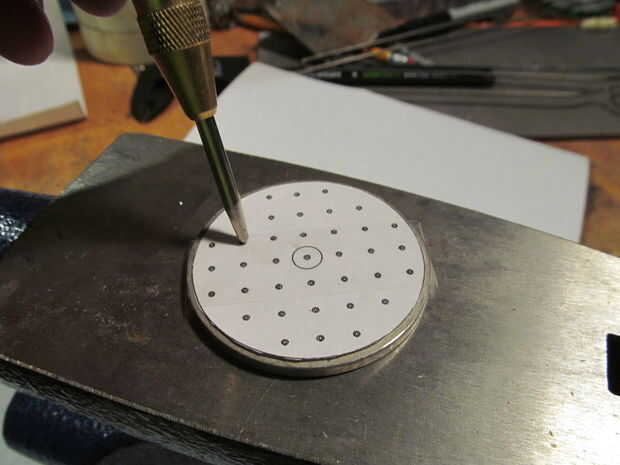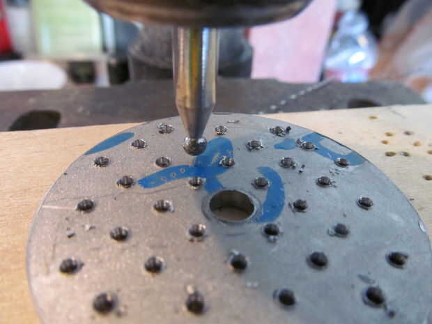 AutoCad usando arreglé 36 hoyos en la en un patrón. El diseño a imprimir, había grabada en el disco y utiliza un punzón para marcar hacia fuera. Luego usé una 1/16 broca para los orificios.