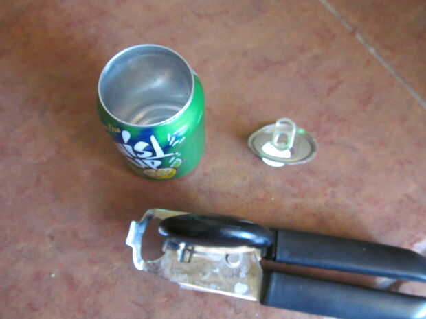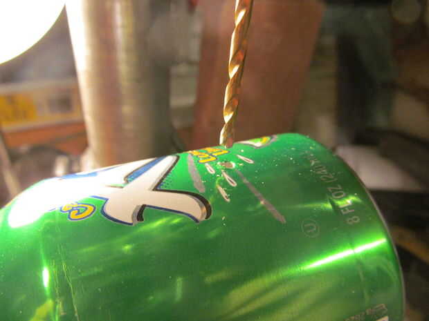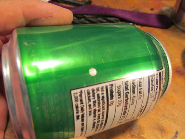 Esta parte es realmente estrecha. Uso un abrelatas para quitar la tapa de un refresco entonces puede perforar dos agujeros de aproximadamente 1" de la parte inferior. Asegúrese de que los agujeros son sólo lo suficientemente grandes como para que la mecha pase a través.
