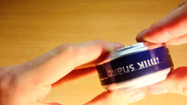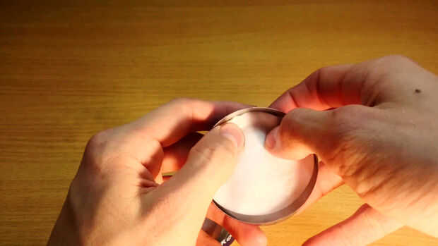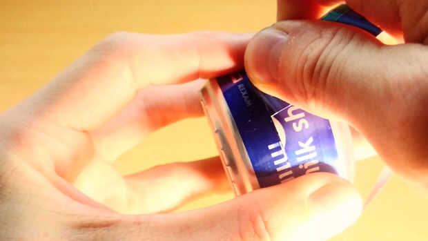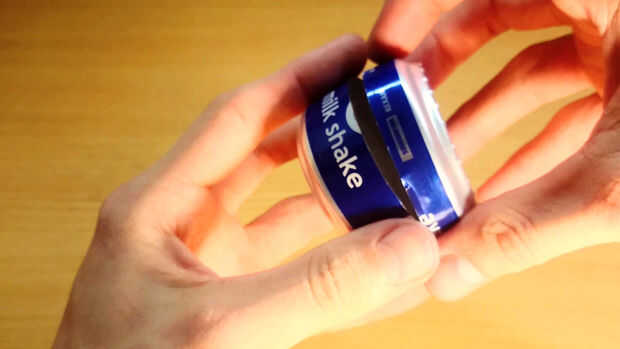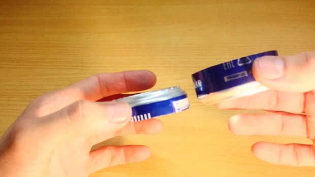 Ahora tenemos que poner la parte inferior dentro de la parte superior. Y esta operación es complicada. Utilice una tira pequeña de la lata para que sea fácil.