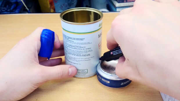 Entonces necesitas una lata un poco más grande que la estufa para hacer un stand y transformar este poco alcohol estufa en primus. Se puede ver que nuevo es ligeramente más grande que la anterior, son casi idénticos. ¡ Una marca de lata en la altura de la estufa, y luego otro en 5 mm más altoy luego tercero marcar – 2 veces más alto que 2 marcas anteriores.
