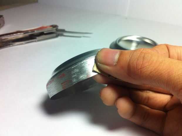 En primer lugar, perfore un pequeño agujero en la parte superior de la lata. Entonces use sus tijeras afiladas para cortar las medidas deseadas. Recuerde empezar cortar de arriba a abajo y el otro puede debe ser más corto que el otro (como se muestra en la última foto). Después de cortar dos de las latas, las latas de arena hasta que desaparece la etiqueta. Asegúrese de la etiqueta de las latas de arena. Si no la arena, la etiqueta de alguna manera se derretirá y negro arruinando así la apariencia de la estufa.