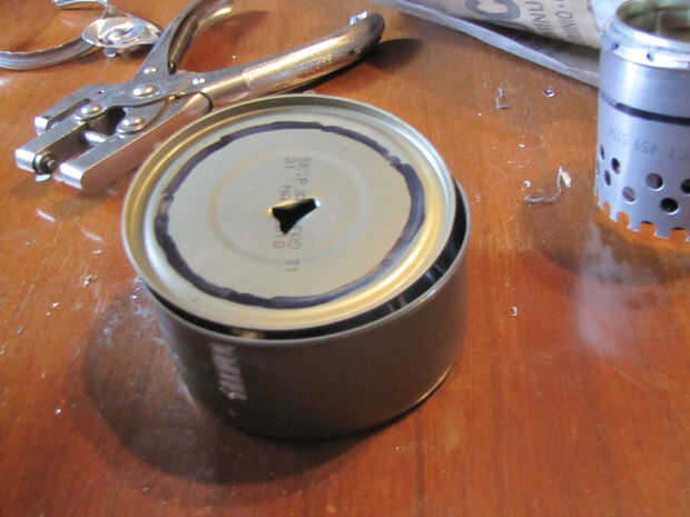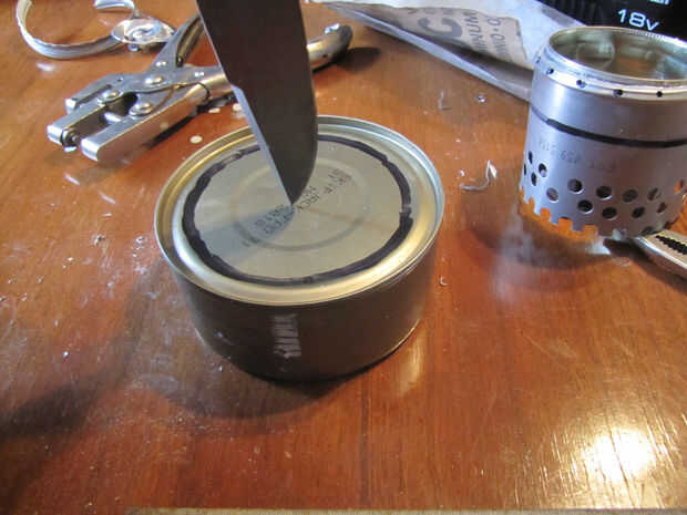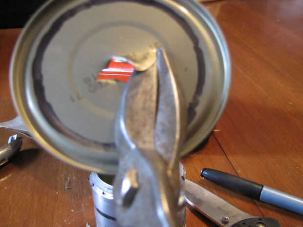 a continuación perfore un agujero en el centro de la tapa de atún (usé un cuchillo de bolsillo para esto) y luego con su tinsnips corte en espiral