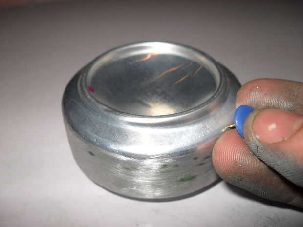 Casi lo hemos hecho!, ahora todo lo que tienes que hacer es conseguir un thumb tack y crear 9 orificios de ventilación. Se encontró que es mejor hacer 8 orificios alrededor del borde y uno en el centro. El agujero en el medio se utiliza para verter el Alcohol en y los agujeros alrededor del borde se utilizan como chorros de llamas en su cocina de gas.