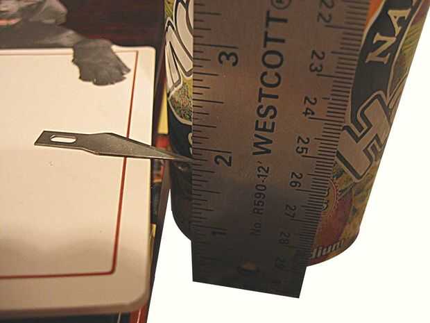 (Método de puntuación – establecer una hoja de utilidad en un libro sobre el tamaño que necesites y gira su puede contra esto. Si usted tiene una plataforma robusta, puede girar alrededor de la una o dos veces y utilice esta línea para hacer una lágrima limpia o utilizar la marca a la guía de corte con tijeras. http://zenstoves.net/ConstructionStep3-trimming.htm)