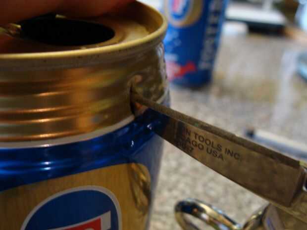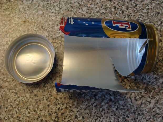 Poco a poco reducir el lado de la lata hasta llegar a la marca de puntuación que hiciste con la maquinilla de afeitar. Tenga cuidado de no cortar más allá de la marca de puntuación aunque. Una vez allí, el fondo de la lata debe separar del resto bastante fácilmente, dejándote con un corte muy uniformemente puede inferior.