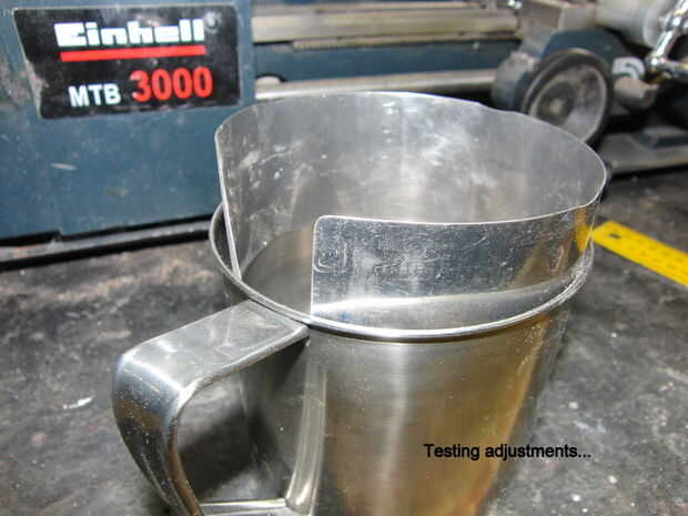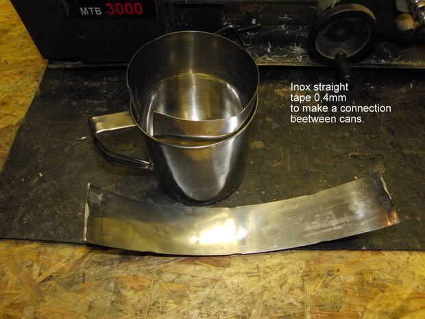 necesito hacer una conexión entre dos macetas. Tomé una tira de acero inoxidable y forma un collar interior que rodea la parte superior del pot/can.