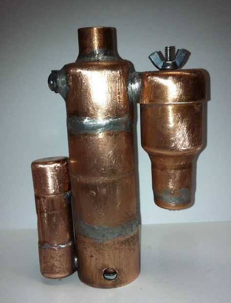 Una cosa que he intentado era hacer la cabeza de la preparación de un par de conectores de manguera de cobre. El problema era que eran demasiado grandes, hizo la cabeza de preparación mientras la caldera y apretándolos juntos realmente fue apretado no fácil debido a la empuñadura restringida en la pieza. Entonces surgió la idea de usar un simple tornillo y una tuerca de mariposa para unir todo. Fácil de construir, fácil de usar y más barato que la primera alternativa.