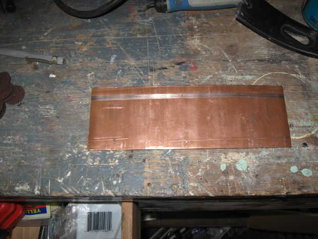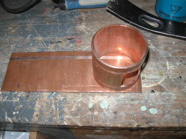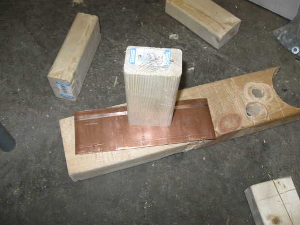 Tendrá una sección de cobre plana. Usé una sección del tubo de desecho para proporcionar esto. Aplanar con pedazos de desecho de madera y un martillo en lugar de sólo un martillo ya que este deforme el metal. Quiere una superficie uniforme, plana.
