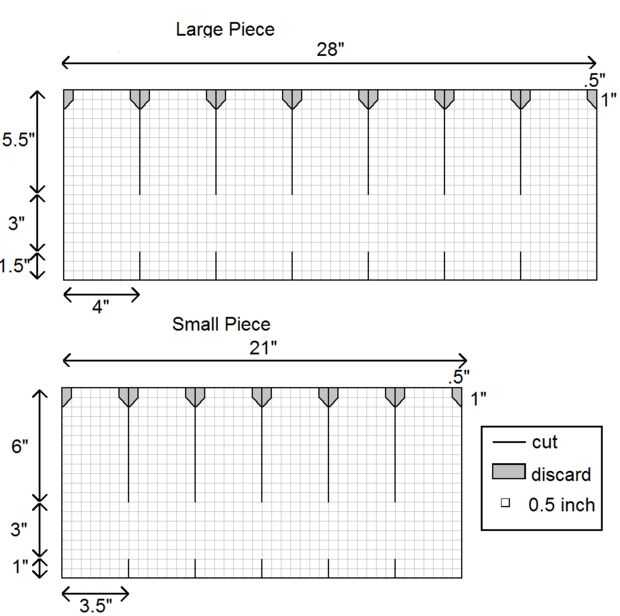 5. en cada aleta grande, hacer una marca de 0.5" de cada lado y 1" de la parte superior.
