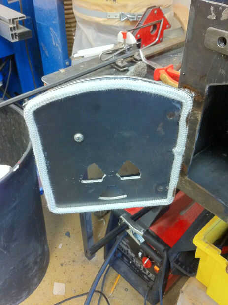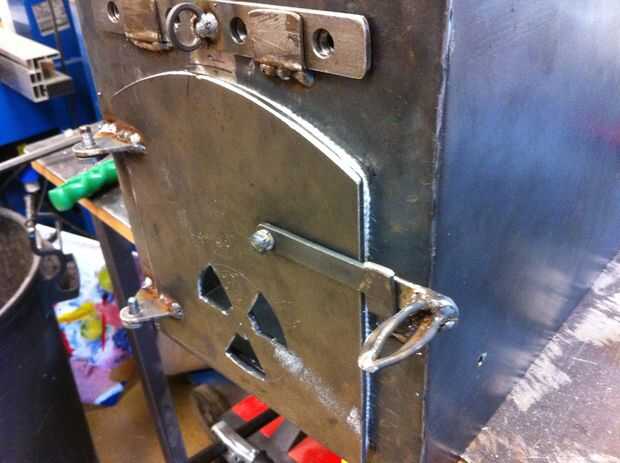 También cabe un respiradero en la parte superior, encima de la puerta y esto es para la combustión secundaria. Esto fue muy sencillo de hacer y solo puse la barra plana en la parte delantera y perforados a través de dos piezas para alinear los orificios. Entonces soldó con autógena los soportes pequeños para que se deslice en y un anillo en la parte delantera para moverlo con.