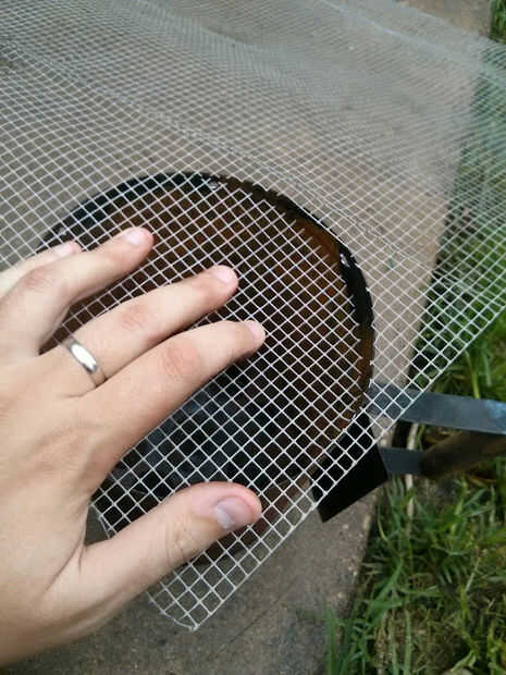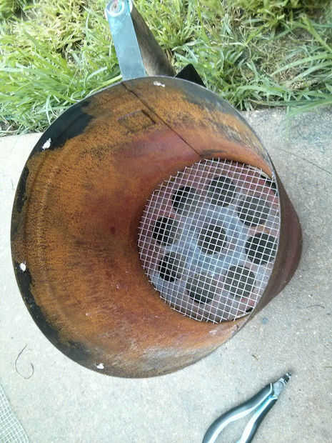 Este es un paso opcional y será totalmente innecesario si usted sólo planea usar carbón de leña. Un arranque de carbón de leña se hace ya con una rejilla de agujeros grandes para mantener el carbón en. Sin embargo, si usted planea usar ramitas y tal, el acoplamiento más fino mantendrá las ascuas ardientes de caer hacia fuera.