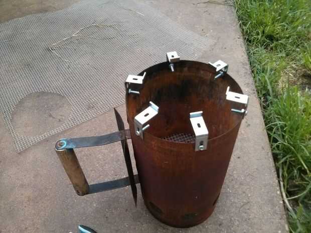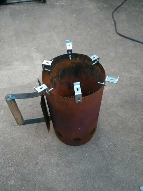 Con sus tornillos y pernos, afix sus soportes en el exterior de su motor de arranque. Usted necesitará asegurarse de que usted consigue los soportes recto e incluso. Sus soportes son eventualmente donde pones tu pan. Decidí poner la mitad de ellos orientación en y hacia la mitad, de esa manera puedo calentar una lata o un recipiente más grande. La versatilidad es importante después de todo!
