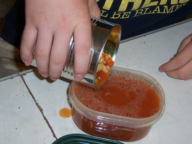Primero: cortar la etiqueta engomada, siendo cuidadoso para los dedos. Segundo: Quitar la tapa superior (no el inferior). Tercero: Vaciar la lata en el recipiente. NO RETIRE LA CUBIERTA INFERIOR TODAVÍA!!!!!!