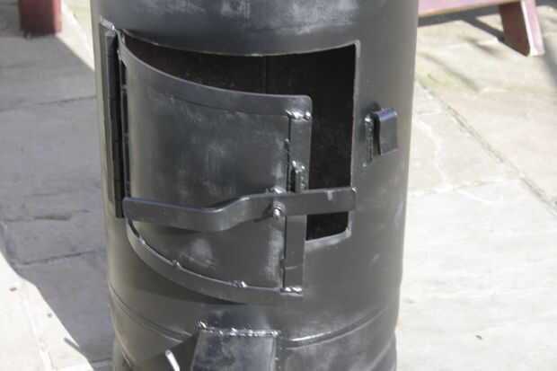 Con la bisagra de la puerta, vuelva a colocar la puerta en la abertura y soldar el otro lado de la bisagra a la botella, asegurándose de que la puerta se abra y cierre sin coger demasiado.