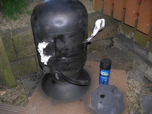Después se une la base cubre todas las partes que no quieres pintar y rociar con una pintura especial de la estufa. Se trata de la primera capa de pintura.