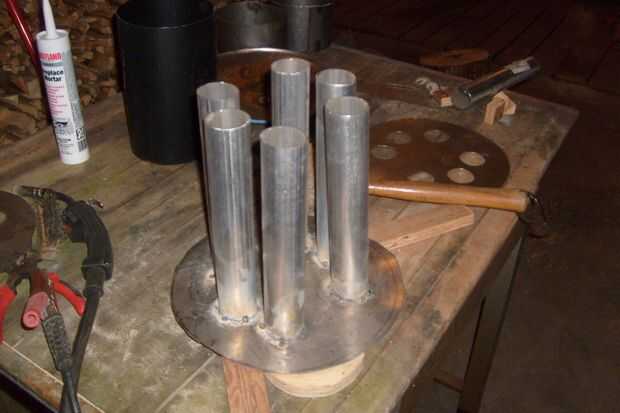 Usando un escriba, o lo que sea, colocar el patrón para los tubos. el número de tubos que se utiliza determina el patrón. Usted puede cortar una plantilla para esto pero, todos los tres discos tienen que estar alineado con este patrón. Me refiero a que tienen que coincidir. Utilicé una sierra de agujeros de 1 1/2" y corte los orificios de los tres discos. Los dos extremos pueden y deben ajustarse apretada. La placa de limpieza debe deslizarse libremente en los tubos. Recuerde no puede escaparse, por lo tanto, los extremos deben quedar firmemente. Nos aseguraremos de ello más adelante.