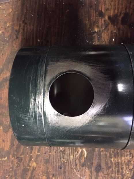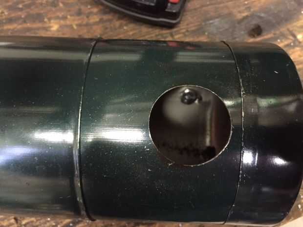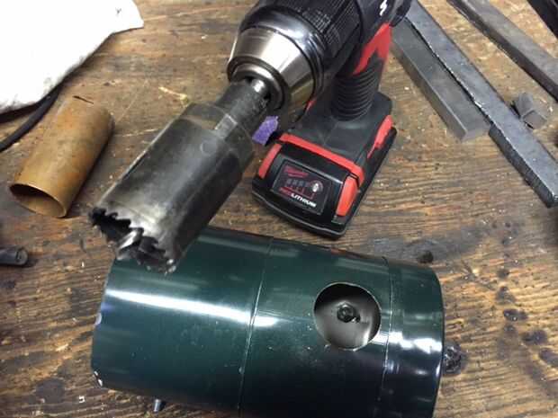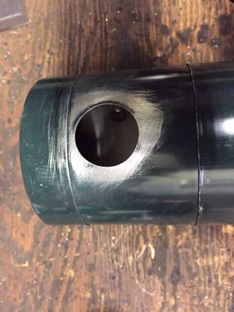 Usé un 1.5 en serrucho para perforar el agujero de la chimenea. una vez que terminó lijar la pintura. Adicionaron flujo limpiador. Esto crea una superficie limpia para el hilo de estaño.