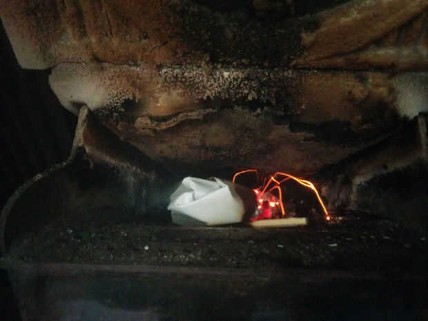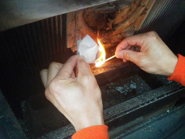 Cuando llega el momento de encender el fuego, la luz del borde inferior del paquete. No es necesaria la valentía extrema, sólo asegúrese de que el papel es atrapado antes de caer el paquete en el fuego bien. Cerrar la puerta a la estufa y encienda el ventilador. El fuego es bueno para ir.
