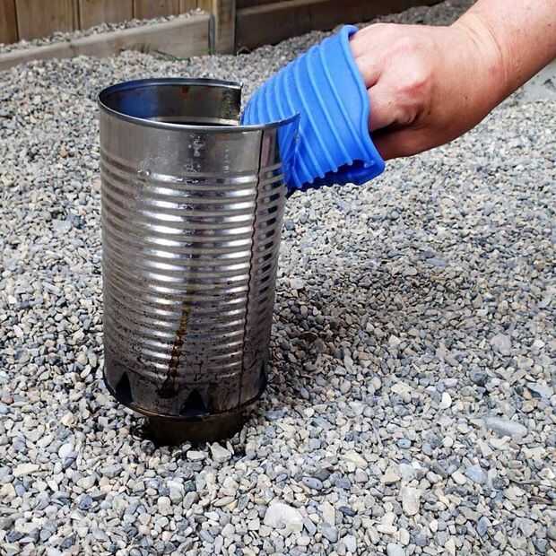 2. Con manoplas, da la vuelta a la lata grande y usa el extremo cerrado para apagar el fuego de la tierra. Oh, da la vuelta a la tierra y deja se apague a sí misma.
