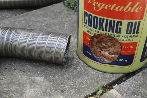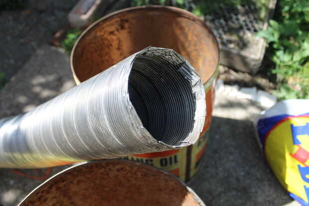 Ahora usted necesita cortar un agujero en la lata de aceite que todavía tiene un fondo para la chimenea. Una pulgada de lo de abajo es buena (Foto 3).