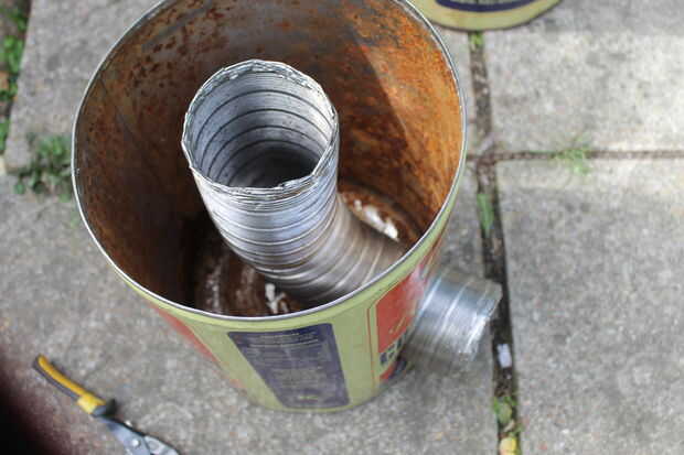 Pase el tubo por el agujero y doble de manera que es un ángulo agudo como usted puede manejar y la chimenea es más o menos en el centro de la lata (foto 4).