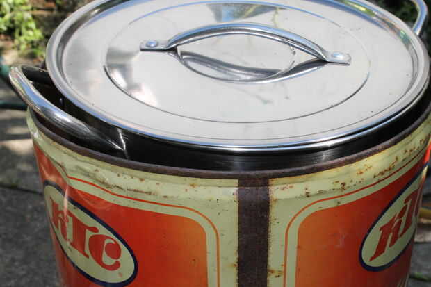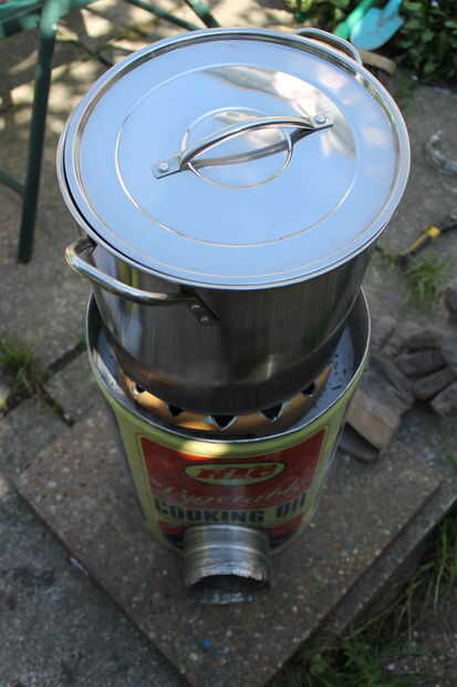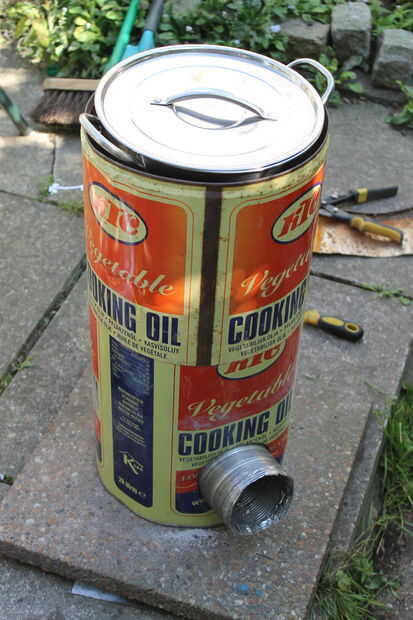 Medir contra tú pan y luego cortar la segunda lata de aceite para que te ajuste durante la primera y darte suficiente espacio para agarrar los mangos de las ollas.