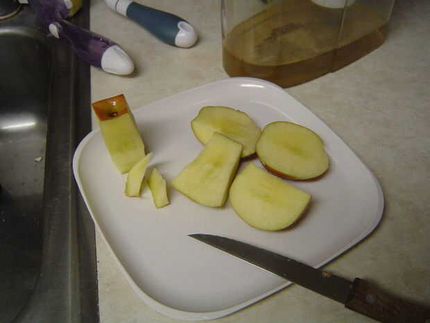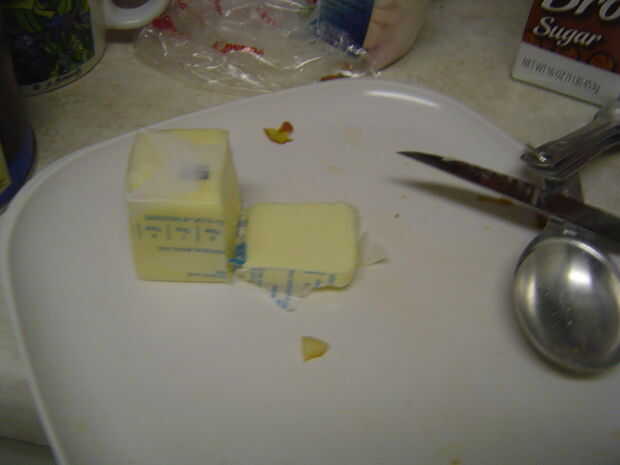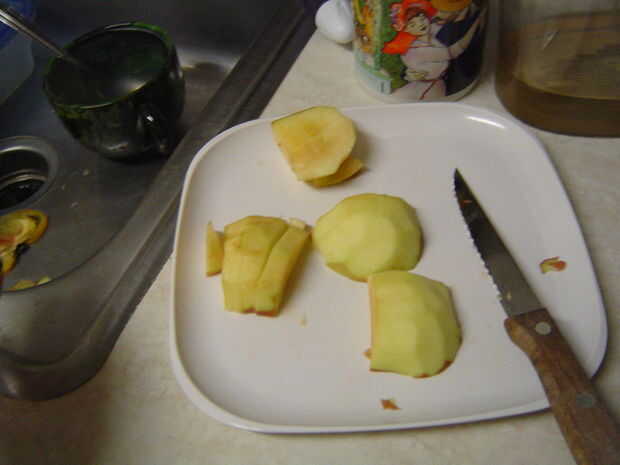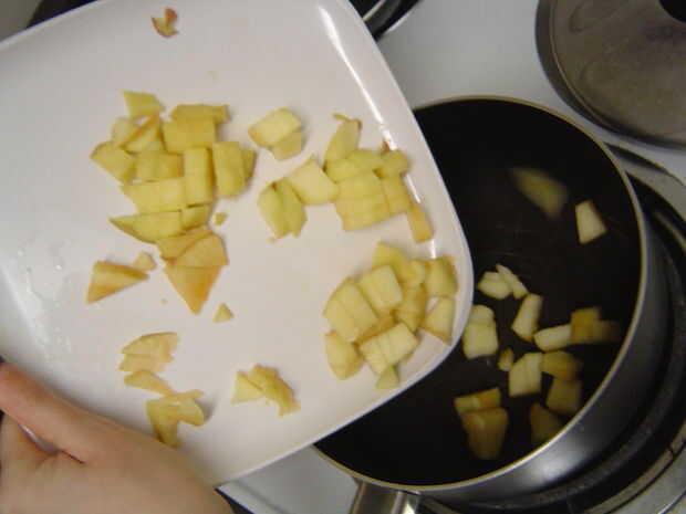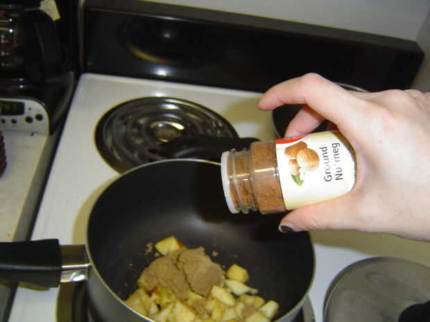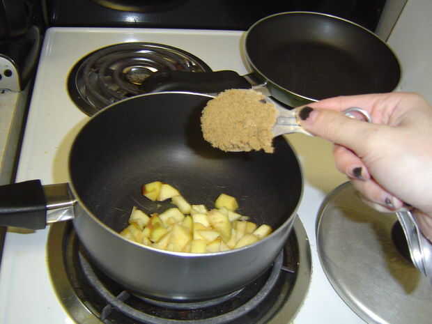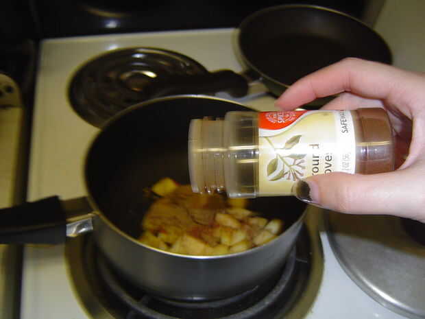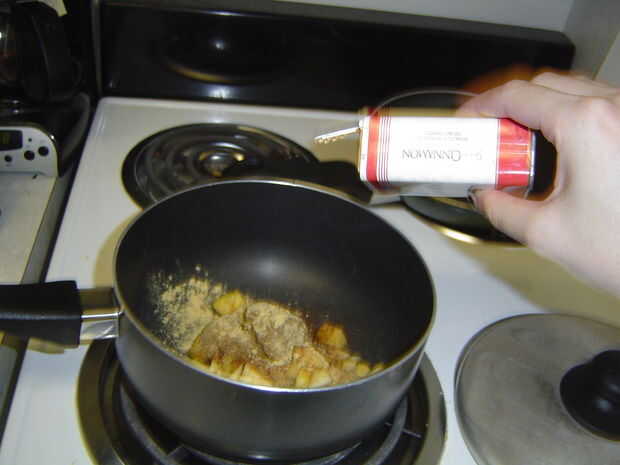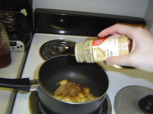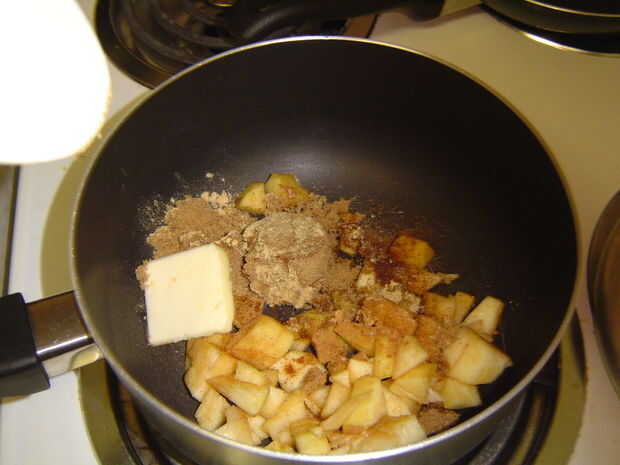 Mezcle en la olla pequeña con la mantequilla. Añadir una ligera capa de azúcar y una pizca de cada uno de sus especias. He utilizado jengibre, canela, clavo de olor y nuez moscada. Puse un montón de especias en más usé azúcar morena, así que el mío es bastante oscuro. Espolvorear un poco de agua y una pizca de harina. Cubra y cocine a fuego lento suavemente mientras la corteza. Mi estufa se estableció en 4 de cada 10.