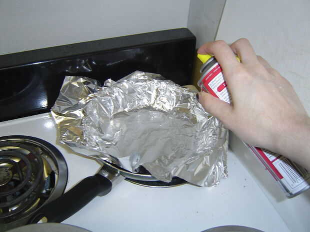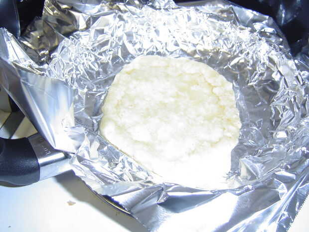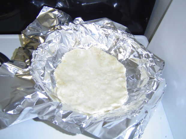 Línea de la bandeja con un cuadrado de papel de aluminio un poco más grande que él. Niebla con algún aerosol antiadherente. Aplanar la masa en un disco de 1/4" de espesor y centro sobre la bandeja. Doblar que los bordes hacia en presa de su cumplimentación.