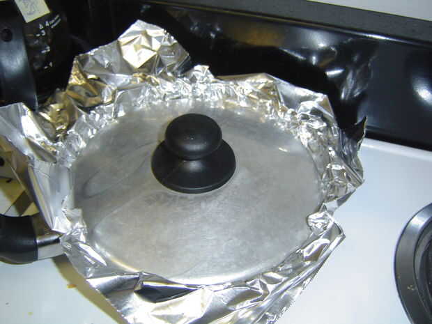 Poner en un quemador bajo temperatura muy baja. Hago 3 de cada 10. Quite la tapa de la olla y cubrir el pastel para crear un mini horno de pan. Funciona bien a fuego lento porque el calentamiento convectivo del aire atrapado entre la tapa y el papel de cocina arriba tan rápido como el calentamiento conductivo de la resistencia a través de la bandeja. Así evita la quema y cocina incluso más rápido que un horno convencional (menor espacio aéreo al calor).