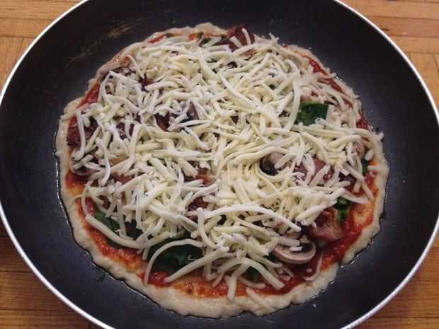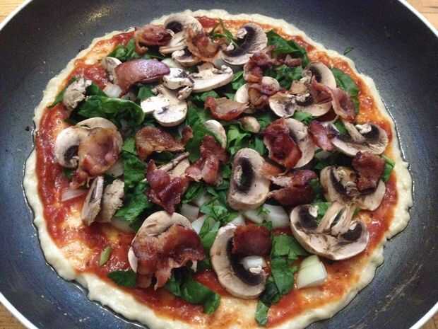 Añadir todos los ingredientes. En primer lugar he añadido cebolla, luego espinacas, luego hongos, luego tocino.