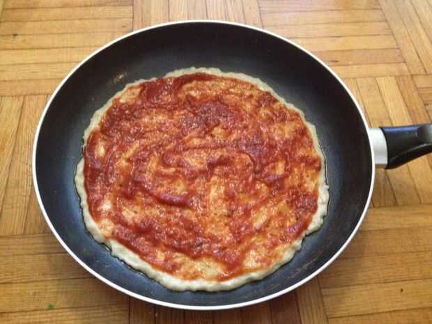 Cuchara alguna salsa para pizza sobre la masa y extender con una cuchara.