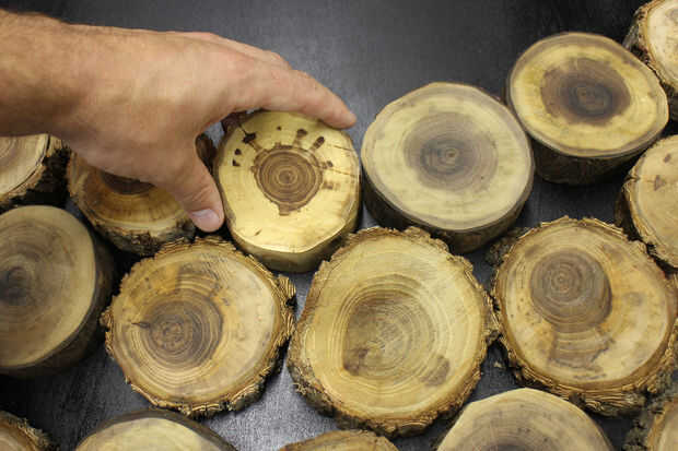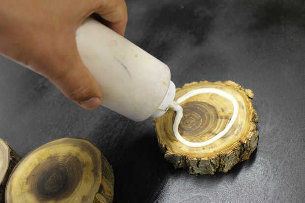 A partir de los discos más grandes, aplique un muy saludable de cola para madera y organizar sobre el tablero. Siguen pegando abajo trabajando hasta los discos más pequeños, asegurándose de que la dispersión de los tamaños de los discos. Terminar pegando con los discos más pequeños que se llenan los huecos entre los discos más grandes.