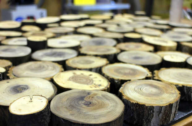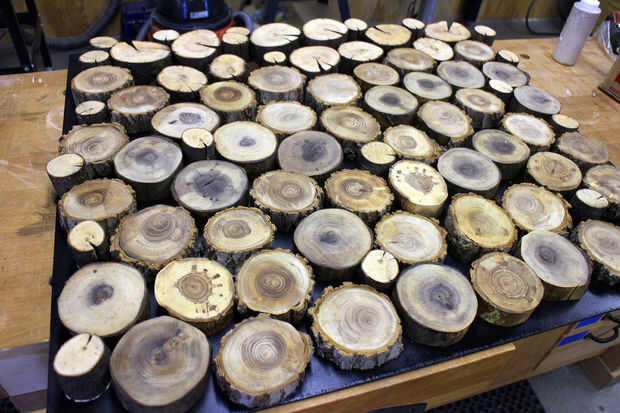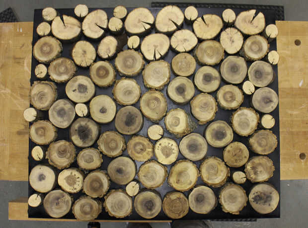 Aquí es lo que parecía mi tablero con todos los discos de madera encolados. Se puede ver realmente la diferencia de profundidades de corte en estas fotos, esto hará que la chimenea parece convincente a simple vista que realmente ha apilado con registros completos.