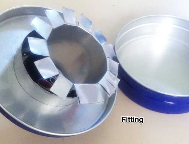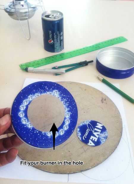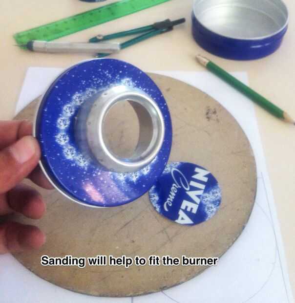 3 después de la puntuación y el corte de la lata de nivea, verifica si tu Pepsi puede (el quemador) encaja en el agujero que acaba de hacer en el frasco de nivea., arena con papel de lija para ajustar el orificio si es necesario para adaptarse a la hornilla.