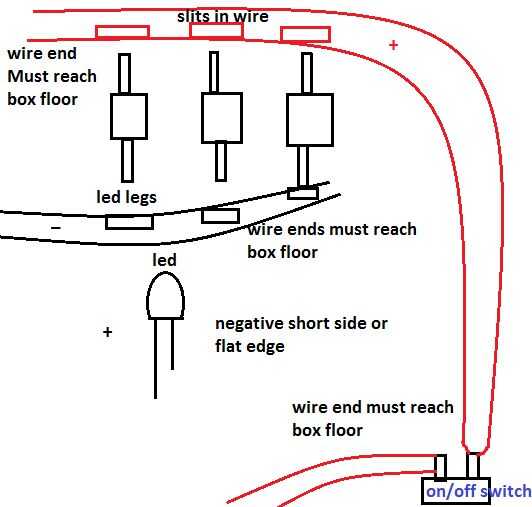 Para los LEDS tuve algunos muy grueso alambre muy largo. Se necesitan dos, uno para positivo y otro para tierra. Medir la longitud, que desea que alcance la parte inferior de la caja aproximadamente donde se llegar a su fuente de alimentación y todos los leds y encendido/apagado. Para cada una de ellas pegar en la parte inferior aproximadamente la mitad de la longitud, los extremos que deba llegar a la parte inferior de la caja y empezar a cortar pequeñas hendiduras en el cable cerca de las patas del led. Ver fotos "artísticas".