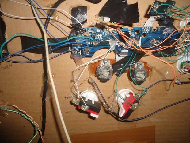 Primero desmontar la PS2 controler y quitar todo pero los botones y analógica de control pcb. Luego pegarlo por debajo con una masa de pegamento caliente y cinta, sólo asegúrese de no cubrir los botones importantes. También cortar cualquier motores, entonces otra vez le dan un agradable zumbido tan probar dejar de alguna manera.