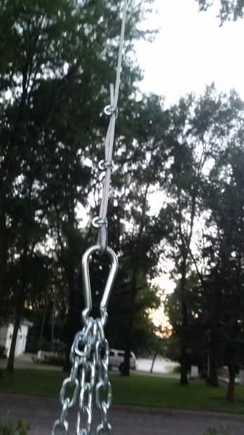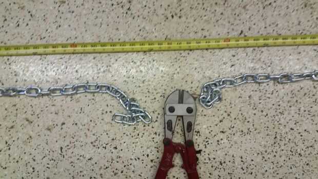 Ahora conseguir tres longitudes iguales de la cadena, en cualquier lugar de 5 pies a 7 pies. Compró un vestido y cortarlas con un cortador de perno, tenga cuidado, que los vínculos tienden a disparar fuera cuando corta. Conectar las cadenas con los pernos de ojo con los tres enlaces, luego conecte las tres cadenas a tu enlace de primavera (que hará fácil encendido y apagado su ancla).