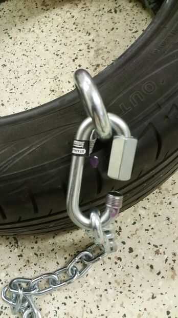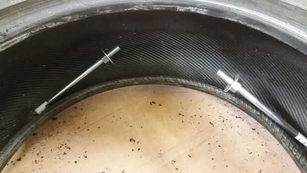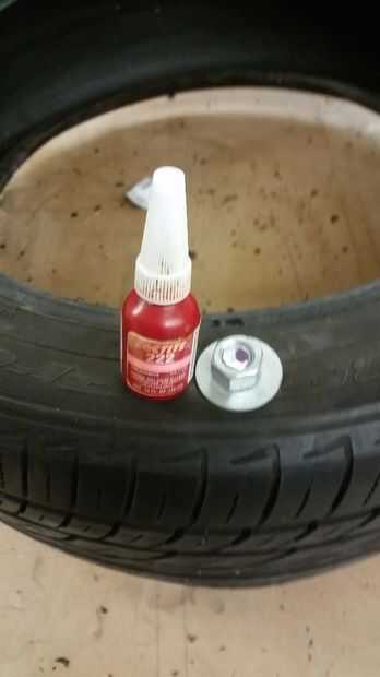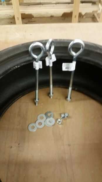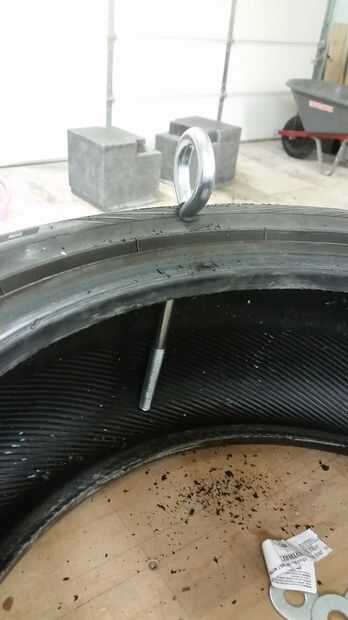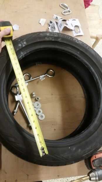 Ahora que tienes el derecho de cosas, puedes empezar algunos agujeros en su neumático. Perforaron tres agujeros equidistantes aproximadamente, usted podría conseguir realmente exactas, pero hice solo un poco vagamente que eran unos 120 grados aparte y radio igual. Inserte los pernos de ojo y marca los agujeros de siguiente (otra vez, no crítica estupenda para tener una alineación perfecta). Dale la vuelta y taladrar los agujeros nuevos. Ahora tres de las tuercas parcialmente abajo el perno de ojo roscado de hilo, poner una arandela en, luego inserte el perno de ojo a través de la capa inferior. Añadir una arandela y una tuerca, locktite todo alrededor. Apriete las dos tuercas de uno contra el otro intercalando entre una pared de neumáticos. Esto le dará una buena conexión sólida con tu ancla nueva.