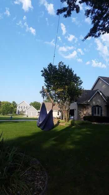 Tenía una sección de cable de acero que encima de mi anclaje del árbol, usé una sección de 8' para crear el soporte superior. Garantizar dos lazos alrededor de los agujeros previamente perforados y entonces crear un lazo del ojo en el centro de la misma. Luego coloque la hamaca con dos lazos de cuerda.