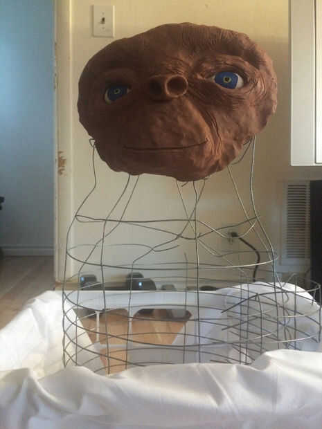 3. situar la cabeza de E.T. en el cuerpo. Puede que necesite cortar algunos de los alambres y doblarlas para que peguen a través de los agujeros que has hecho en la cabeza de E.T..
