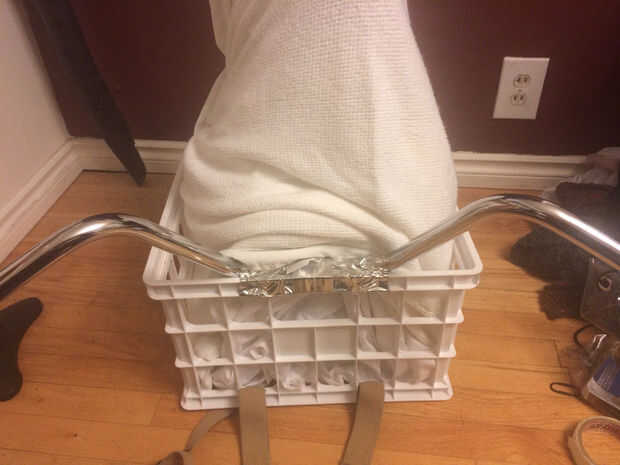1. Tome algunos manillares de bicicleta antiguo (prueba ebay o amazon) y tubo con cinta adhesiva a la parte posterior de la canasta.