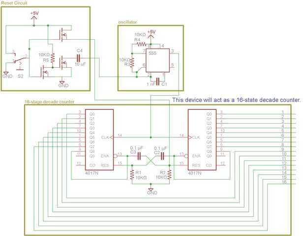 Los alambres verdes 16 a la derecha del esquema son las 16 salidas.