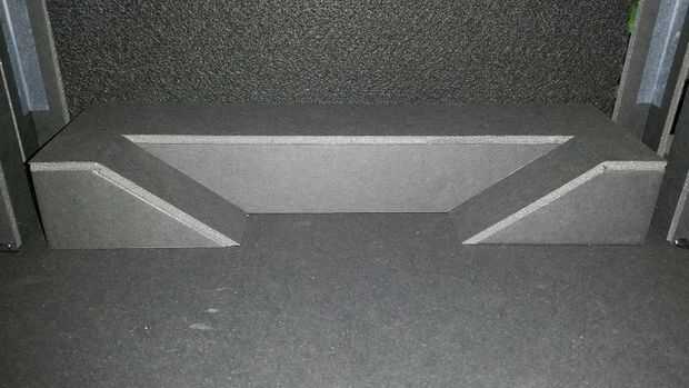 Este paso es complicado. Se trata de un montón de medición y corte cuidadosamente. La pieza superior con las rampas de la plataforma se hace de una sola pieza de espuma base a 11x3.25inches. Desea hacer un corte en la base de la espuma para hacerlo lo tienes rampas para doblar hacia abajo. Mis rampas son 2,75 pulgadas de largo y 1,25 pulgadas de ancho. Para hacerlos doblar agradable y fácil vas a querer cortar algunos de la espuma de la parte inferior donde están haciendo el doblez. El resto de este paso es sólo cortar pedazos de núcleo de espuma para esta plataforma superior para sentarse. Me aseguré de volver a la altura de 1.5 pulgadas. Garantizar todo lo necesario para el escenario principal con la pistola de pegamento caliente.