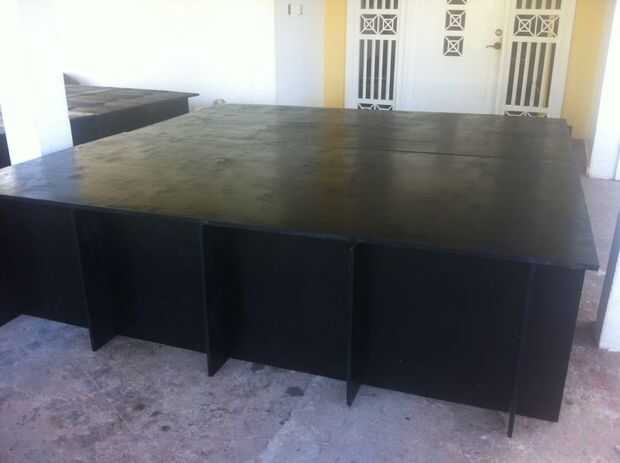 Español. Necesitaba un escenario para una presentación con las siguientes características: * Liviano. Buscando en internet encontré esta página vende un producto muy parecido a lo yo lo, luego de ver las fotos y el video decidí vovere a intentar hacer algo similar, espero no violar ninguna patente o derechos de autor. Metros de la de 2.44 x 4.88 x 0.6 en mi caso necesitaba un escenario (4' x 8' x 2'). metros de 2.44 x 2.44 x 0.6 de la cuadrados "módulos dos pero en realidad son" (4' x 4' x 2') así estas instrucciones están clusiones en 1 modulo, ustedes pueden replicarlo según sus necesidades, también pueden marco la altura. Materiales: de (madera contrachapada) triplex 5 láminas de 14mm (9/16") - Para la estructura En algunos lugares donde venden el triple prestan el servicio de corte lo cual es muy conveniente ya saludando cortar todas las láminas de 14mm (9/16") por la mitad en el sentido más largo, al final deben quedar 10 laminas de 0.6x2.44 metros (2' x 4') aproximadamente, este tipo de cortes son mas precisos con una sierra de banco y una buena guía para garantizar todas las piezas queden del mismo tamaño. El triplex de 19mm (3/4") no lo debe cortar.