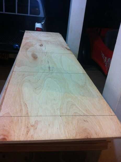 Primero tienes que cortar las hojas de 14mm (9/16 ") madera contrachapada por la mitad para que sean 0.61x2.44 mts (2 'x 8') como se muestra en la imagen.
