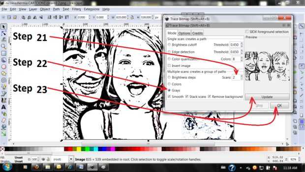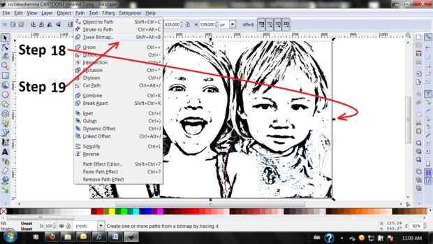 - Una vez abierto en Inkscapehaga clic en la imagen, esto hará que una caja negra con flechas en las esquinas para aparecer. Seleccionar la ruta de la tapa y elija trazar mapa de bits