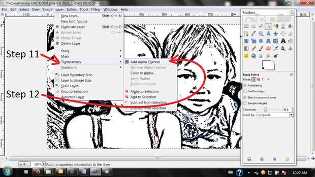 - De la gota abajo elegir transparencia y seleccione añade canal alfa