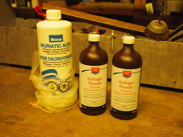 - Una vez que esté todo que Darth Vader-ed usted puede mezclar sus productos químicos. La proporción es de 2 piezas 3% de peróxido de hidrógeno a 1 parte de ácido muriático - en ese orden! Nunca agregar el peróxido al ácido ya que puede causar una reacción inestable