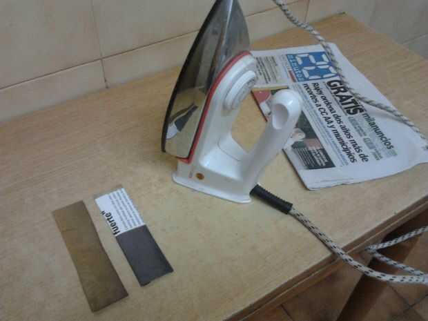 Ahora limpiar bien su reaaaaally de chapa de latón. Refriegue con un estropajo. La clave aquí es dejar surcos pequeños en el metal para que el toner se fije mejor a él cuando usted calor. Una vez que estés satisfecho con los resultados... Gire otra vez para limpiarlo. Asegúrese de no dejar grasa ni suciedad en él. Encender la plancha a su valor máximo. Pegue el papel con la foto que imprimió hacia el bronce ahora limpio con alguna cinta. Y.... hierro lo. Prensa y hierro, tómate tu tiempo para aprender el proceso. Asegúrese de que usted traslado todo el toner a la letal. Generalmente 3 minutos es más que suficiente de presionando y calefacción. Ten cuidado porque el metal se calentará. Echar en el agua y pelar con los dedos el papel. Los dedos es el mejor, tootbrush podría funcionar pero corre el riesgo de suprimir algunos toner mal conectado.